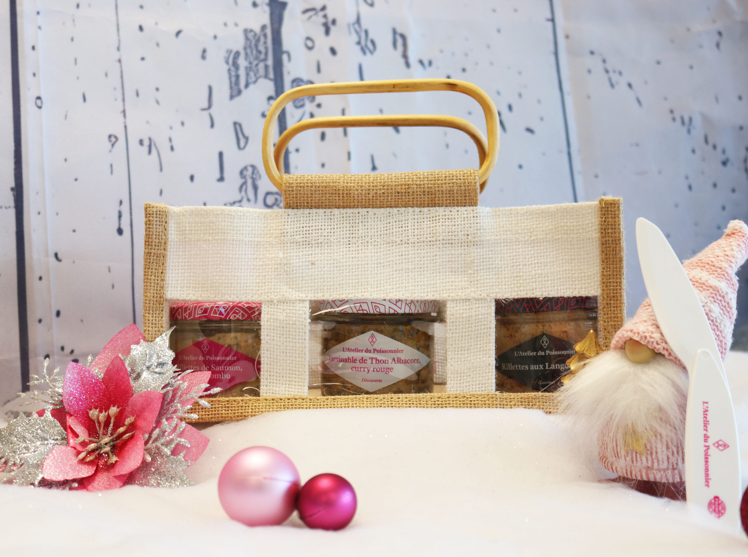 Sac en jute naturel, doté de fenêtres transparentes et de anses en bois ovales.